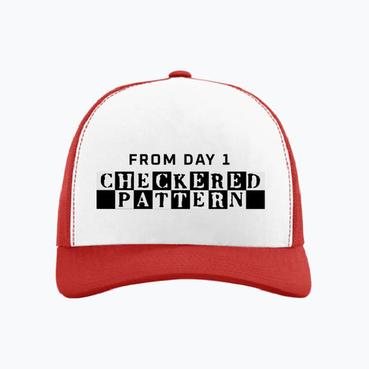 • A straight-on view of a black and white trucker cap featuring the red 'Checkered' text with 'Black Squares and White Spaces' tagline.