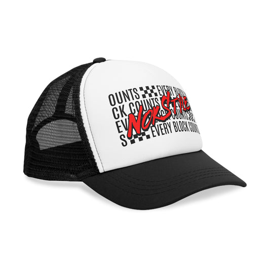 • Front view of a NOK Style trucker cap with 'Every Block Counts' graphic text and red NOK Style logo.
